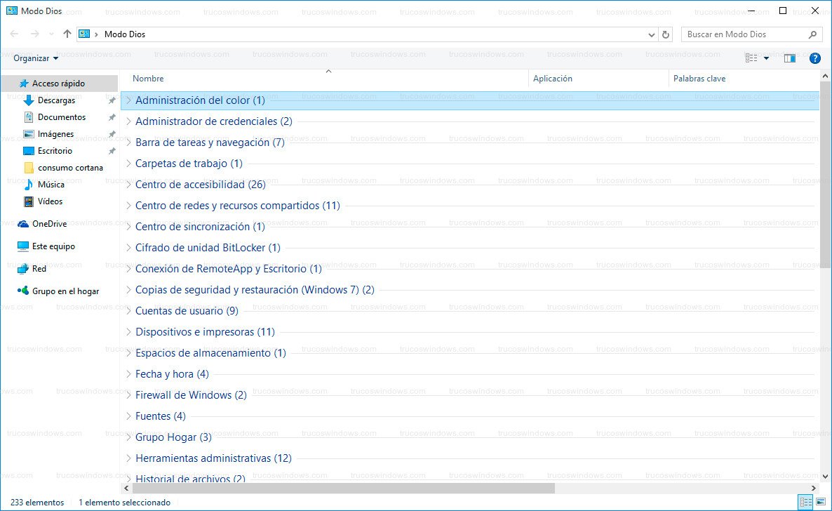 Al ejecutar el modo dios, podemos ver los distintos grupos de categorías expandidos, en la segunda columna a que aplicación pertenece y la tercera columna las palabras claves que tiene asignadas.