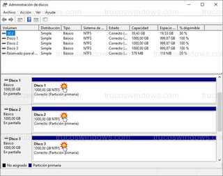 Y comprobamos solo si reconoce las unidades que vamos a usar para el Raid 5, da igual que estén sin inicializar, o que tengan espacio no asignado, solo comprobamos que las reconozca. En este caso son tres discos duros de 1 Tera cada uno (1.000GB).