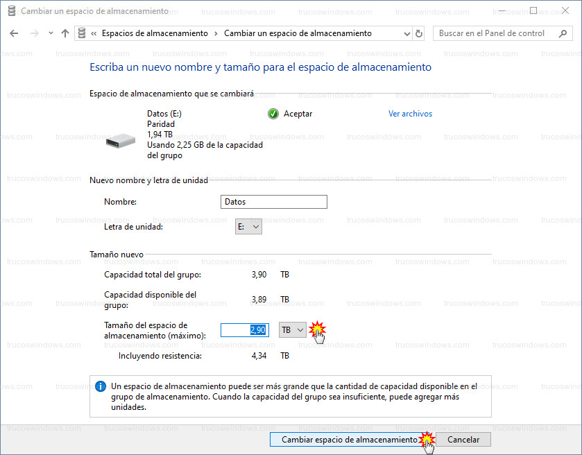 Ponemos el tamaño que se muestra en “Incluyendo resistencia” (2,90),dentro de la caja de texto del tamaño de almacenamiento y pulsamos en el botón “Cambiar espacio de almacenamiento”.