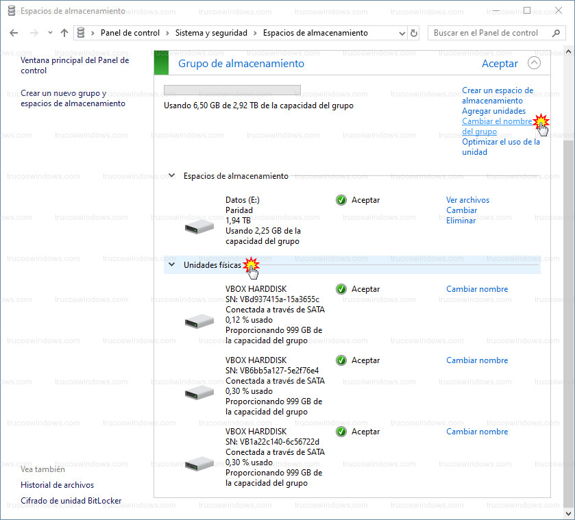 La unidad “Datos (E:)” pertenece al “Grupo de almacenamiento”, para no equivocarnos en caso de tener más discos duros en el futuro podemos cambiarle el nombre del grupo a otro que nos ayude a saber qué tipo raid usa.