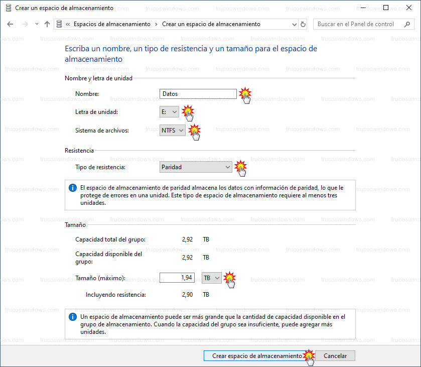 Tamaño (máximo): Por defecto nos aparecerá el tamaño máximo soportado, siendo este la suma de todos los discos duros menos uno.