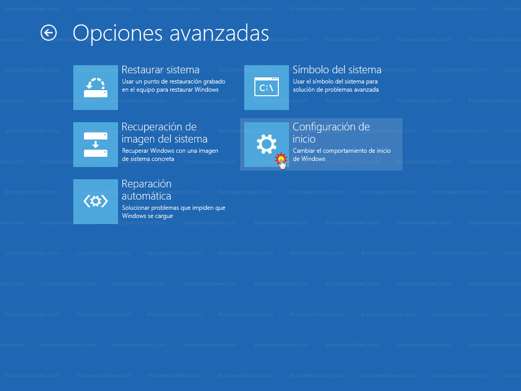 Vuelve a mostrar mas opciones que son, Restaurar sistema, Símbolo del sistema, Recuperación de imagen del sistema, configuración de inicio y reparación automática. Pulsamos sobre Configuración de inicio para continuar.