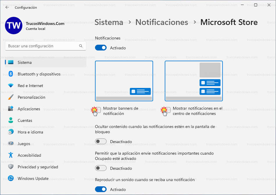 Desactivamos las opciones Mostrar banners de notificación y Mostrar notificaciones en el centro de notificaciones.