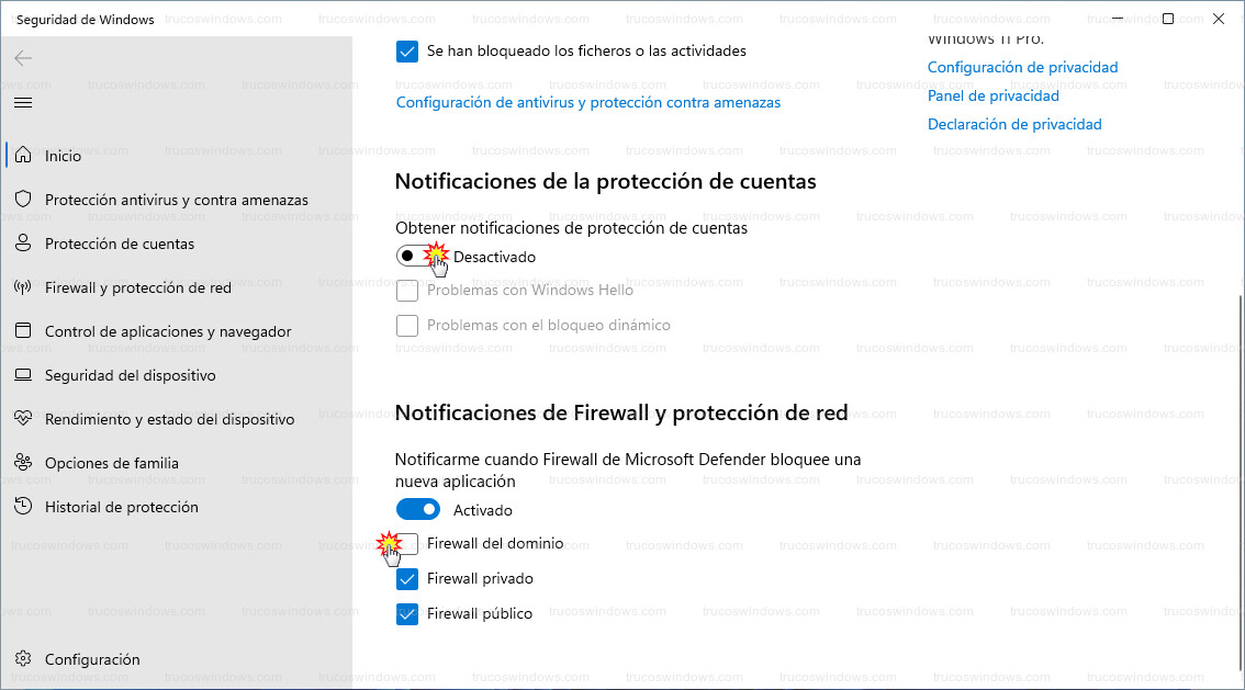 Un ejemplo, dentro de la aplicación de Seguridad de Windows, podemos desactivar las notificaciones de la categoría Notificaciones de la protección de cuentas, pero podemos dejar activadas las notificaciones de la categoría Notificaciones de Firewall y protección de red.