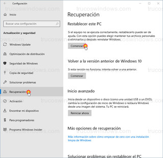 En el menú de la izquierda, pulsamos en Recuperación y en la parte derecha dentro de Restablecer este PC en el botón Comenzar.
